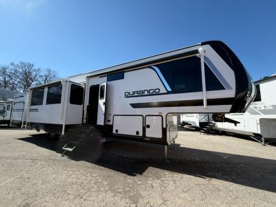 Enjoy full time living, an affordable price, and a wide body construction for more living space with every one of these KZ Durango light high-profile fifth wheels! These luxury units can be used all year round with the all-weather insulation package, the 3" x 14" foam-core in-floor straight-line heating system with a 35,000 BTU furnace, and the 15,000 BTU ducted roof A/C which optimizes the airflow by an average of 40% for better performance, cooling time, and reduction of noise. A few other construction features you will appreciate include a one piece, seamless walk-on Tufflex roofing material, Pex® in-floor heated waterlines, and a Lamilux® gelcoat fiberglass exterior. Inside, blancher maple & morel fog cabinetry , a king size bed, and smart TVs will have you feeling like you never left home!