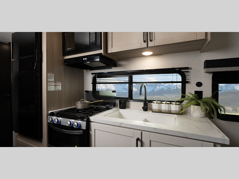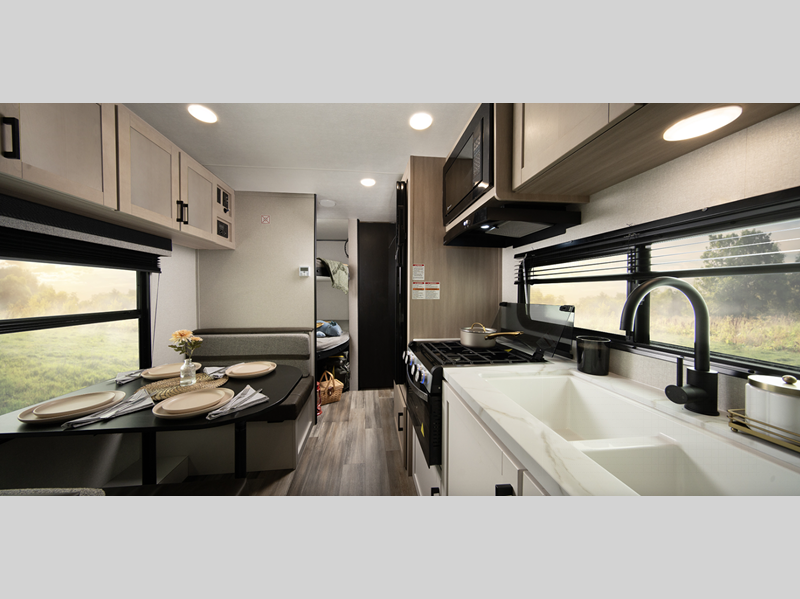 The durable construction consists of a PVC roofing membrane, a ForTruss rafter system, galvanized wheel wells, and a built-in A-frame for added support. You will enjoy your time at the campground with interior comforts such as residential grade kitchen countertops, solid hardwood cabinet doors, and vinyl flooring throughout.