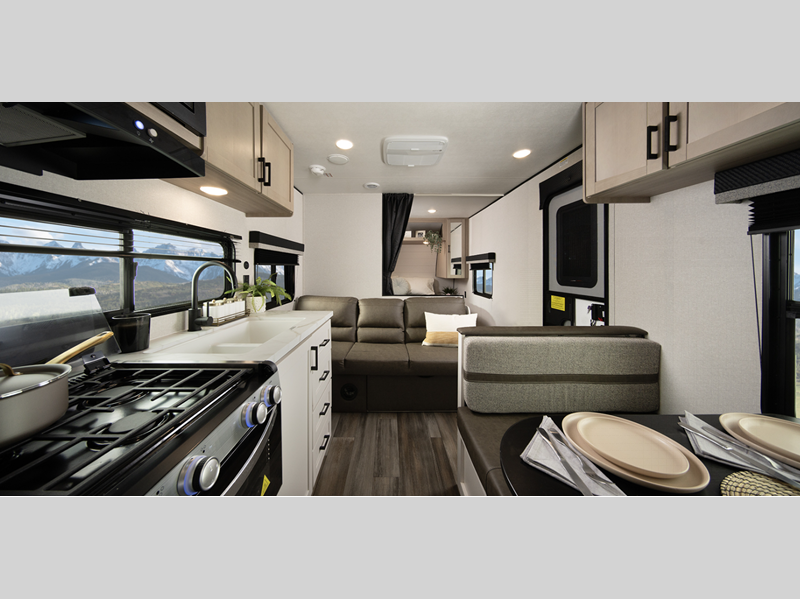 Sleeps 4 Slides 1 Length 31 ft 1 in Ext Width 8 ft Ext Height 11 ft 1 in Int Height 6 ft 9 in Interior Color Coastal Linen Hitch Weight 810 lbs GVWR 7900 lbs Dry Weight 6175 lbs Cargo Capacity 2200 lbs Fresh Water Capacity 52 gals Grey Water Capacity 39 gals Black Water Capacity 39 gals Tire Size ST205/75R14D Furnace BTU 20000 btu Available Beds RV Queen Refrigerator Type 12V Refrigerator Size 8 cu ft Cooktop Burners 3 Number of Awnings 1 Water Heater Type Tankless AC BTU 13500 btu Awning Info 18' Power w/LED Lights Axle Count 2 Shower Type Radius Electrical Service 30 amp Similar Floorplans